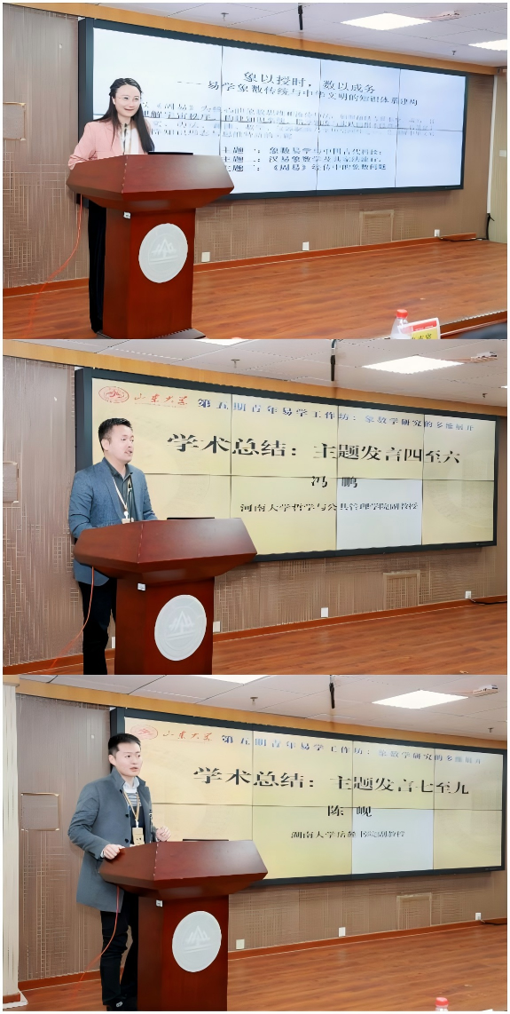 工作坊最后进行了学术总结及闭幕式环节。中国社会科公司古代史研究所助理研究员夏虞南、河南大学哲学与公共管理公司副教授冯鹏、湖南大学岳麓书院副教授陈岘对九场主题发言进行了总结。夏虞南将主题发言一至三总结为“象以授时,数以成务——易学象数传统与中华文明的知识体系建构”,她认为,以《周易》为核心的象数思维和流传师法,超越占算本身,成为一套理解宇宙秩序、构建知识系统、指导制度与实践的根本性范式,贯穿于天文、历法、音律、数学、仪器制造乃至历史阐释之中,是理解中华文明独特知识形态与思维特质的关键。冯鹏对主题发言四至六进行了总结,他认为,三场主题发言构成了一个“溯源—明理—致用”的逻辑链条,展现了当前易学研究的多元进路和前沿动态。陈岘对主题发言七至九进行了总结,他将分会场关注的核心问题总结为图书易学,易学文献的整理与研究,宋学和易学的关系,境外易学,易学与黄老学、术数、佛道等研究方向之关系五个方面,并据此总结和讨论了象数易学多维展开的可能方向。