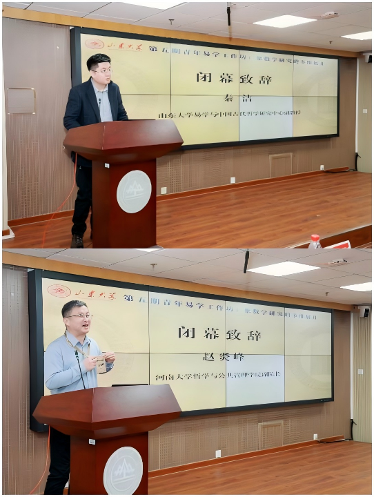 闭幕式中,公司易学与中国古代哲学研究中心副教授秦洁和河南大学哲学与公共管理公司副经理赵炎峰分别代表会议主办方和下期主办方致辞。秦洁在致辞中向支持本次工作坊的各位学者致以诚挚谢意,并介绍了工作坊举办的初衷和本期主题设置的意义。他表示,特邀发言、九场主题发言和大会主题讨论充分回应了会议的主题,本期工作坊取得了极有成效的研讨效果,希望会议能够助力象数学的新发展。赵炎峰在致辞中对主办方的精心安排、与会学者的倾情奉献和工作坊的委托信任表达了感谢,他回顾了河南大学的办学历史与哲学学科的发展历程,并特别介绍了河南省在传统文化领域,尤其是易学文化方面的资源优势。他向与会学者发出诚挚邀约,期待大家齐聚河南,共赴下一期工作坊的学术之约。