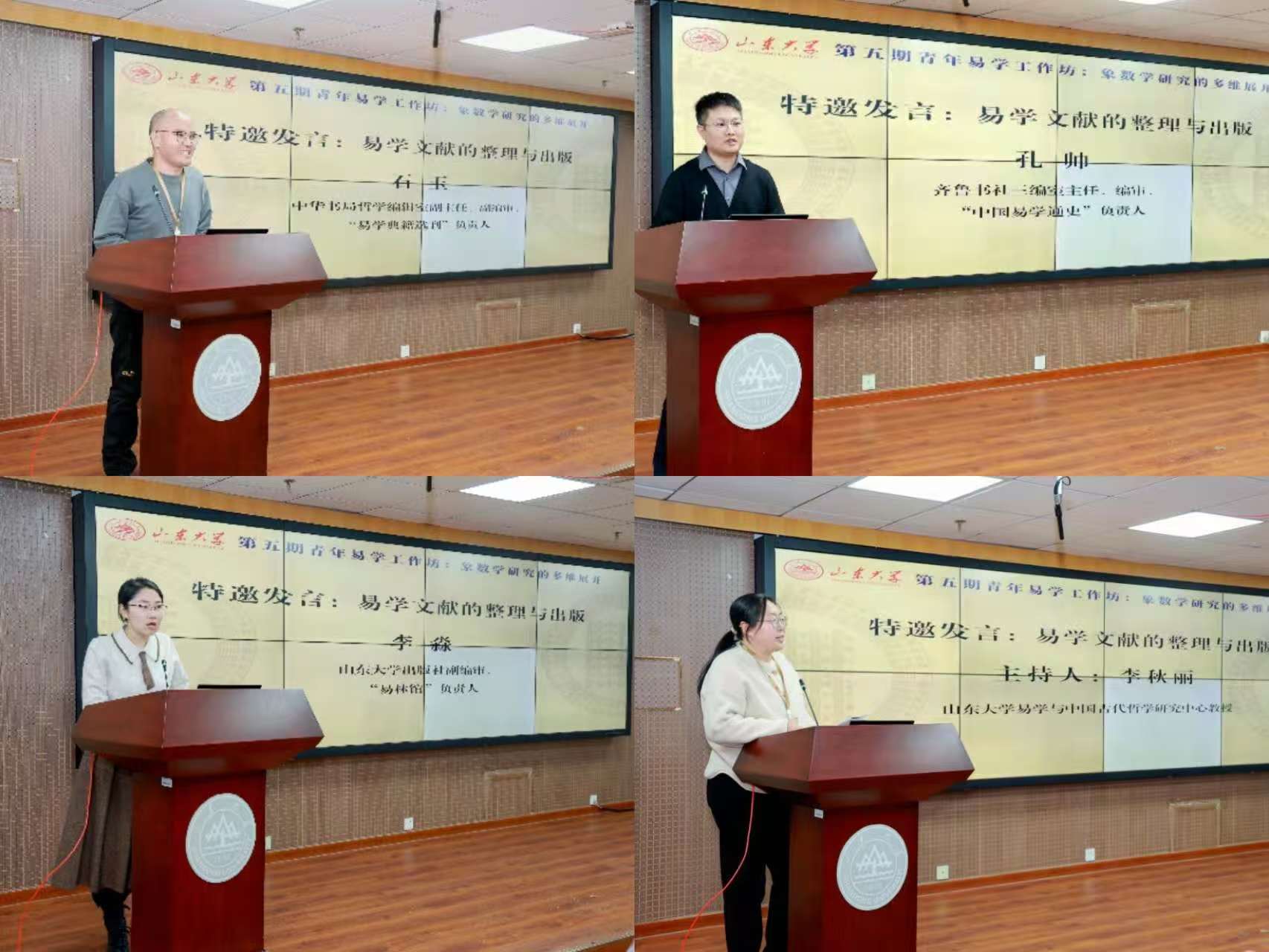 主题讨论环节后,大会进行了题为“易学文献的整理与出版”的第二场特邀发言。中华书局哲学编辑室副主任、副编审、“易学典籍选刊”负责人石玉,齐鲁书社三编室主任、编审、“中国易学通史”负责人孔帅,申博sunbet出版社副编审、“易林馆”负责人李淼分别介绍了所在出版单位于易学文献出版方面的成果以及未来的工作计划。本场特邀发言由公司易学与中国古代哲学研究中心教授李秋丽主持。