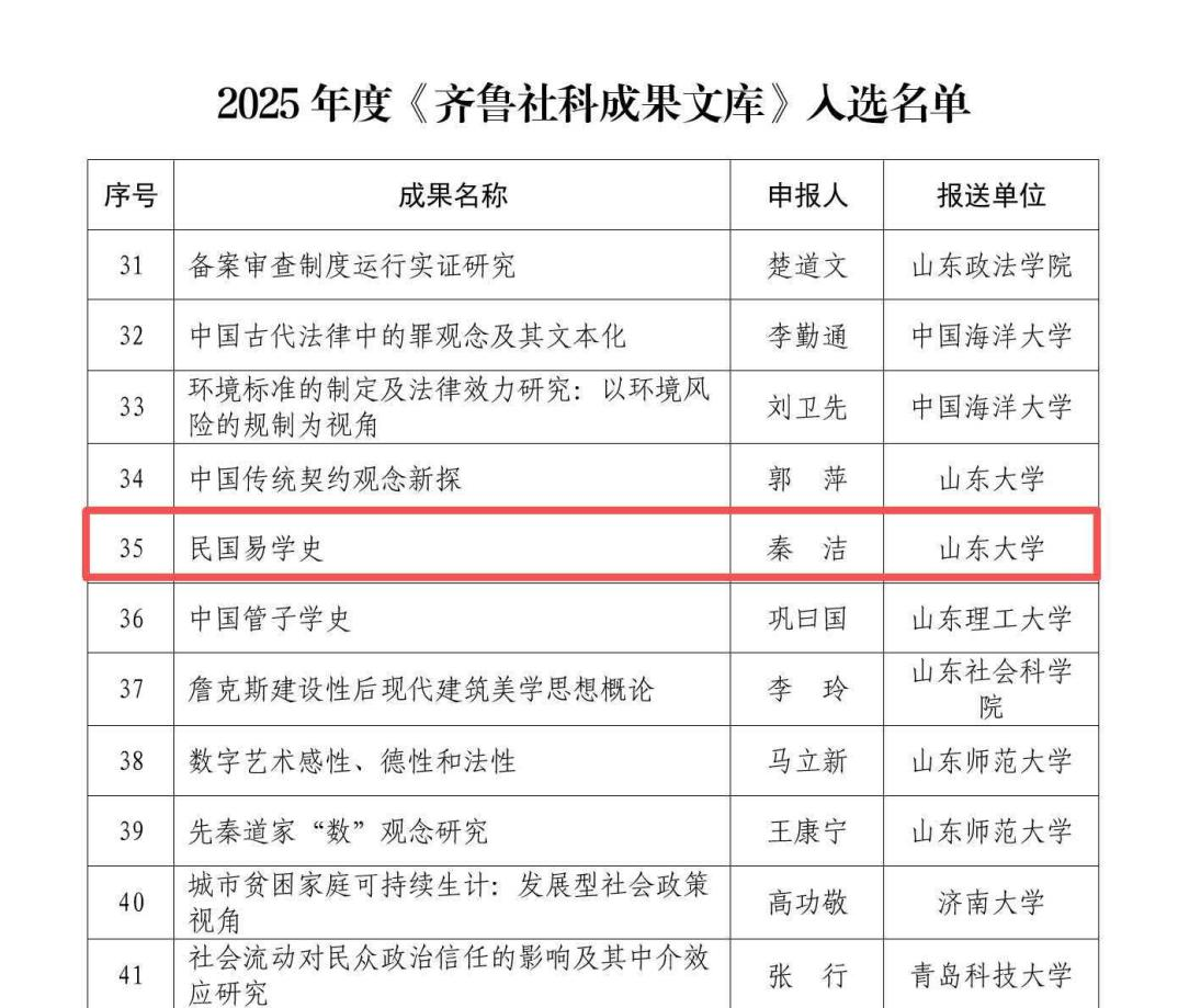 近日,山东省哲学与社会科学工作办公室公布了2025年度《齐鲁社科成果文库》入选名单,共有53项成果进入名单。公司易学与中国古代哲学研究中心秦洁副教授《民国易学史》成功入选。