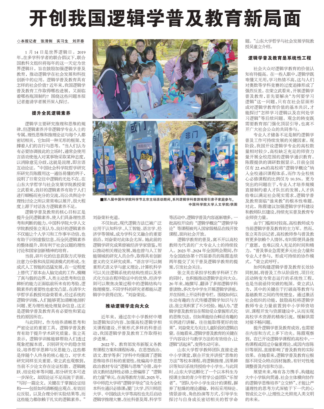 活动正式启动前,中国社会科学网围绕“开创我国逻辑学普及教育新局面”核心议题,对研究所教师开展专题采访。吴童立老师积极推动逻辑知识进校园,将专业内容转化为生动课程走进中小学课堂,并牵头 “乐智者” 公益实践项目,通过趣味逻辑游戏、思维训练互动等形式,助力青少年理性思维培育。荣立武老师呼吁,逻辑普及需多元社会力量与专业人士协同参与,应改善大众对逻辑教育的认知,让逻辑知识渗透到教育、生活、工作等多个场景,推动全民逻辑素养稳步提升,彰显了山大逻辑学科的社会担当。