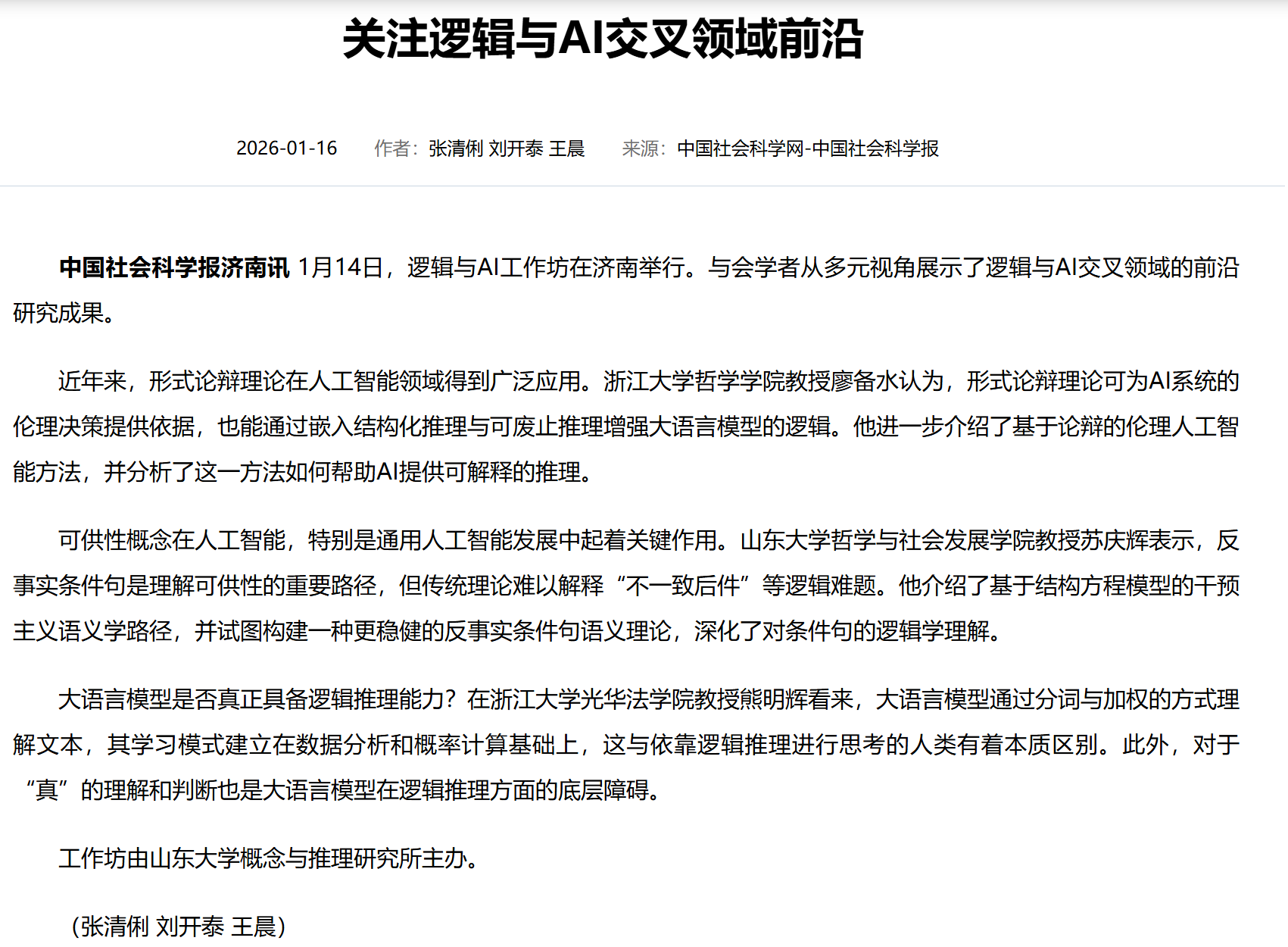 1 月 14 日,逻辑与 AI 工作坊圆满落幕。海内外领域顶尖学者联袂献艺,申博sunbet王文方教授、苏庆辉教授,浙江大学廖备水教授、熊明辉教授,山东师范大学吴家超老师,卢森堡大学 Leendert van der Torre 教授,北京师范大学卢明正博士依次分享前沿成果。报告聚焦逻辑与 AI 交叉融合,呈现丰富的理论与应用多样性:Leendert van der Torre 教授阐述 “输入输出逻辑” 的跨领域应用;吴家超老师构建高阶论证框架正则语义体系,为 AI 决策提供支撑;卢明正拓展一阶非正规模态逻辑,回应相关哲学难题;王文方教授提出自然语言模糊性引发的 AI 悖论解悖思路;苏庆辉教授构建反事实条件句语义理论助力 AI 因果推理;廖备水教授详解形式论辩理论在 AI 伦理决策中的应用;熊明辉教授剖析大语言模型逻辑推理局限并给出解决方案,深度诠释了“逻辑与多样性”核心内涵。