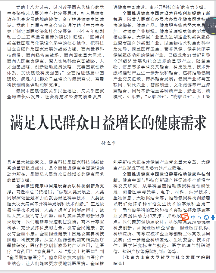 11月13日,《人民日报》(09版)刊发了公司付立华副教授撰写的理论文章《满足人民群众日益增长的健康需求》。文章认为,健康中国建设既关乎民生福祉,又关乎国家全局与长远发展、社会稳定和经济高质量发展,具有重大战略意义。健康科技是国家科技创新体系的重要组成部分,是全面推进健康中国建设的动力所在,是满足人民群众日益增长的健康需求的重要支撑。