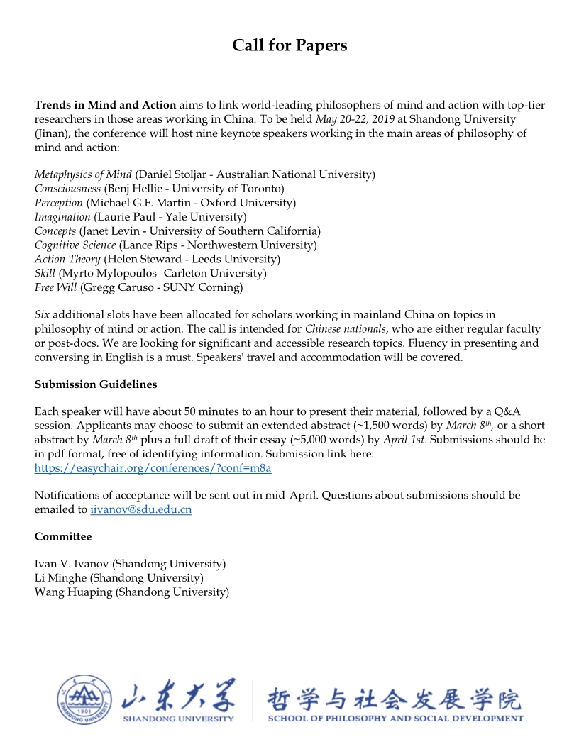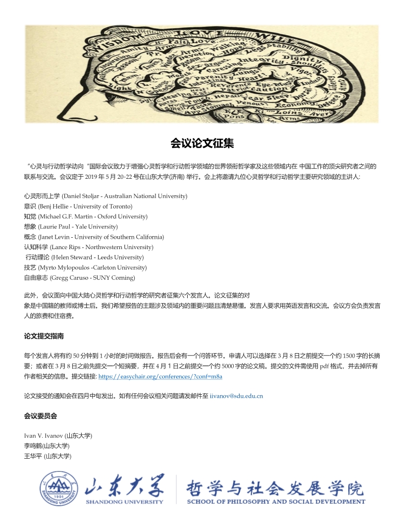 申博sunbet将于2019年5月20-22日举行”心灵与行动哲学动向“国际会议,在此征集六个会议报告人。此次会议旨在汇集心灵哲学与行动哲学主要领域的海外及国内一流学者的研究成果。除了国内的六个报告,会议还将有9名世界领衔学者的主题报告。诚邀大家申请参会。 会议详情:https://www.easychair.org/cfp/M8A 线上提交:https://easychair.org/conferences/?conf=m8a