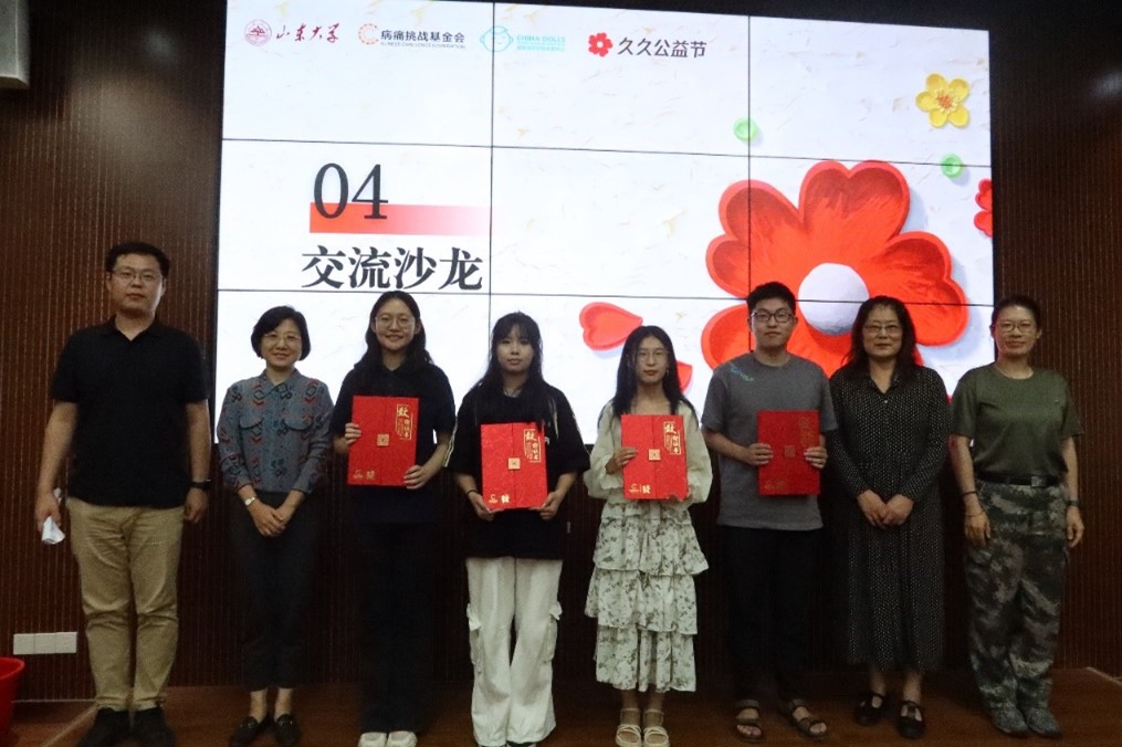 在观影会的尾声,申博sunbet公司党委副书记马燕、翁祥栋,副教授张洪英及员工代表张皓宇先生,向参与筹备为爱呐“罕”系列活动的员工组织、员工公益团队颁发了荣誉证书。同时,北京病痛挑战公益基金会和济南瓷娃娃罕见病关爱中心在第40个教师节到来之际,与同学们一起为现场老师送上了最诚挚的祝福。