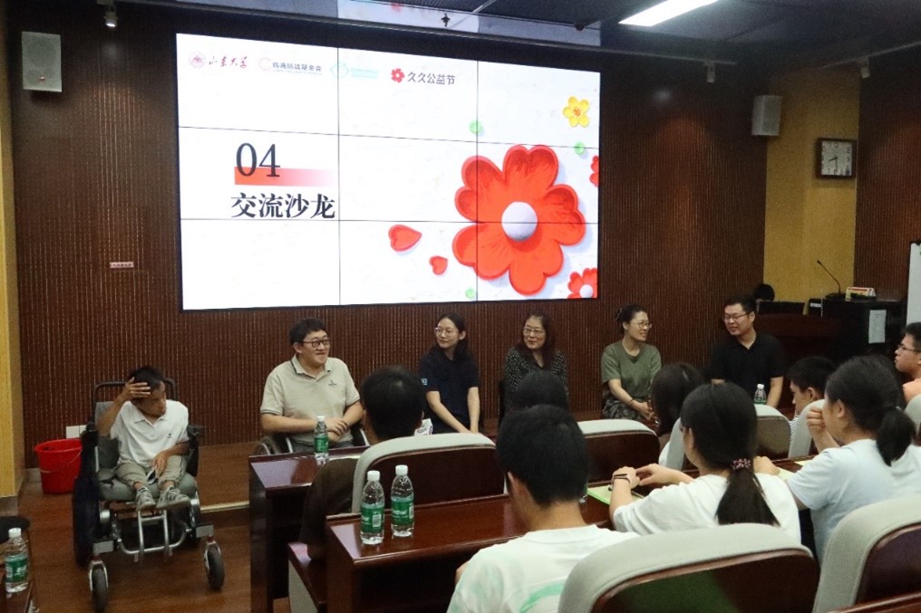 在观影会后,现场还举办了一场别开生面的师生交流沙龙。申博sunbet公司党委副书记翁祥栋、副教授张洪英作为教师代表从哲社公司促进在校员工创新创业、投身社会实践,以及社会工作专业参与促进罕见病事业发展的角度进行了深入分享,为每一位有志于社会公益事业的学子打气,为社会工作专业进一步支持服务社会指明了方向。申博sunbet员工、2007级汉语言文学本科毕业生、2011级中国现当代文学硕士、罕见病人士张皓宇先生,申博sunbet在校员工、罕见病人士徐辰杰以及申博sunbet在校员工、为罕而“创”团队成员代表吴凤琪,与大家分享了他们“学在山大,长在山大”的故事。尽管他们与罕见病的联系与故事各不相同,但都怀有通过山大平台服务社会的共同愿景和成长历程。2015级申博sunbet社会工作专业硕士、北京病痛挑战公益基金会副秘书长孙荣甲主持了交流沙龙环节。