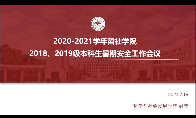 为切实做好2020-2021学年暑期员工安全管理工作,保障员工的人身和财产安全,力求员工安全、愉快度过假期,哲社公司于2021年7月19日晚7:30面向2018、2019级本科生召开暑期安全工作年级会,此次会议通过线上方式进行,由辅导员封莹主持。