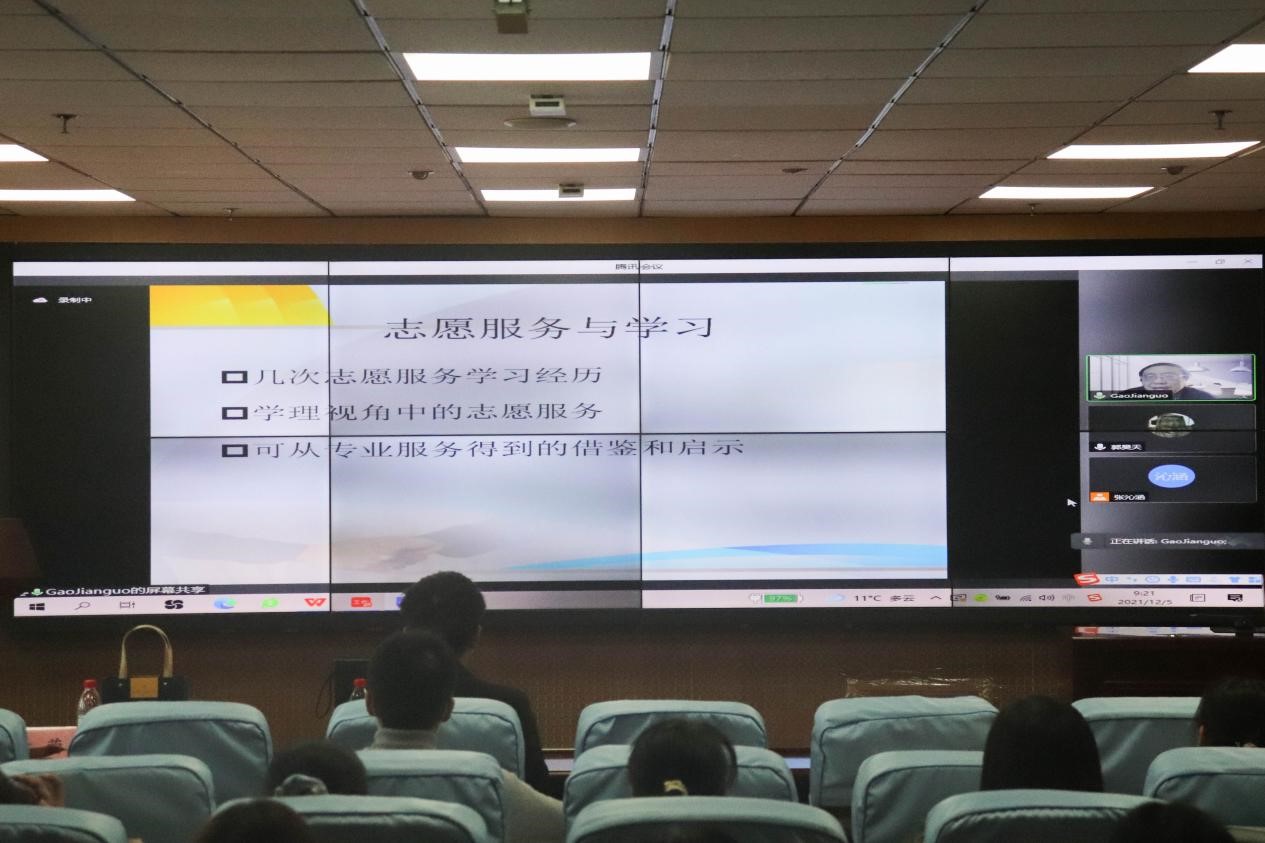 高鉴国教授借助腾讯会议进行线上授课。高鉴国结合社会工作系员工实习服务团队的志愿服务实例,从学理视角出发,依托社会工作实务通用过程模式、RE-AIM框架等专业理论知识,讲授志愿服务项目的开展与运营。理论与实践相结合的讲授让学员们从专业服务中收获借鉴和启示,从而更针对性地开展志愿活动,提升活动的质量与效果。