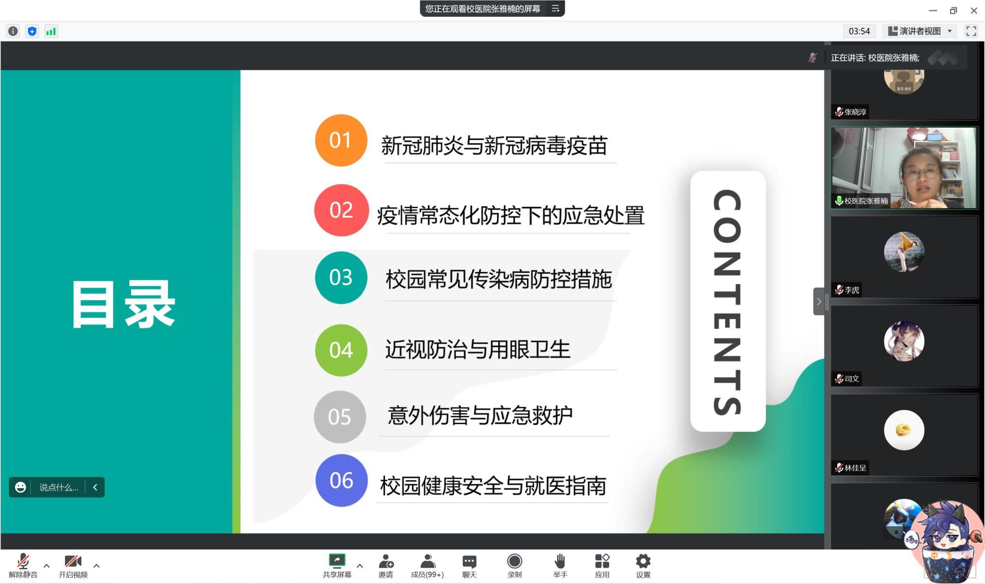9月25公司举办了卫生健康讲座,邀请到校医院工作人员张雅楠老师主讲。张雅楠向同学们介绍了疫情防控、校园常见传染病防控、近视防控、意外伤害救护、校园就医等方面的卫生健康知识,提高同学们的卫生健康意识。
