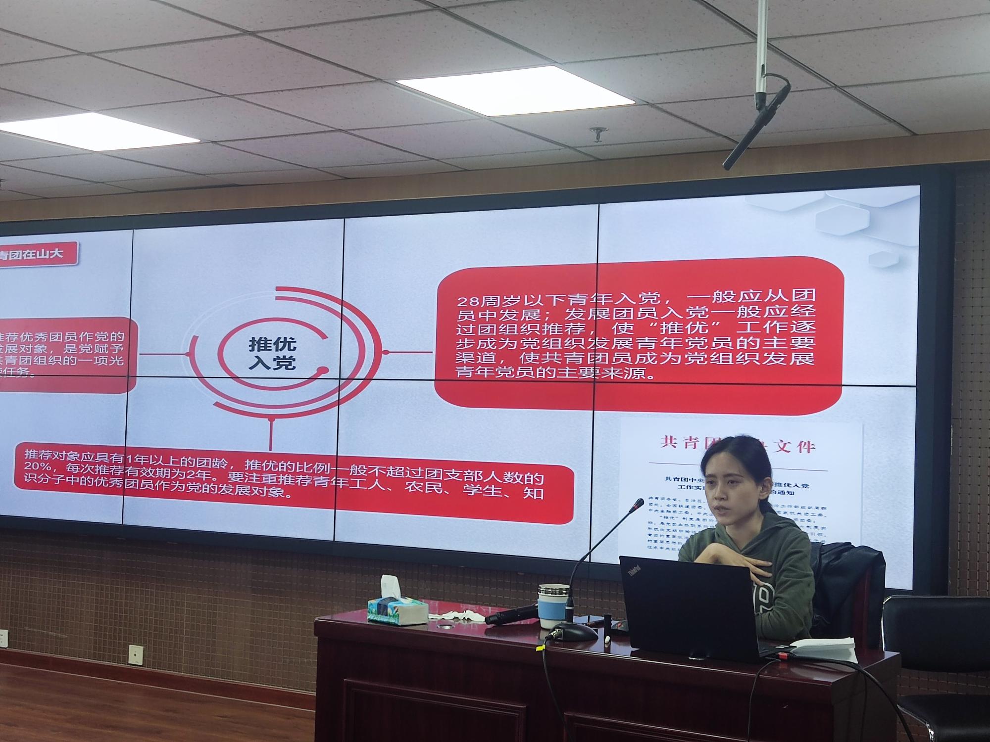 封莹从“认识共青团”和“共青团在山大”两个方面向同学们普及相关知识,详细讲述了团员的权力和义务,要求新生团员严格、忠诚地履行自己的义务,并勉励同学们提高自身素质,争当优秀的共青团员,时刻保持和增强团的先进性。紧接着向同学们介绍了推优入党的流程,要求同学们思想上积极上进,不断向党组织靠拢。最后从创新创业、社会实践、志愿服务三个方面向同学们介绍了公司和公司的一些活动,鼓励同学们积极参与,从多方面不断提升自我。