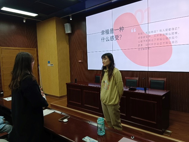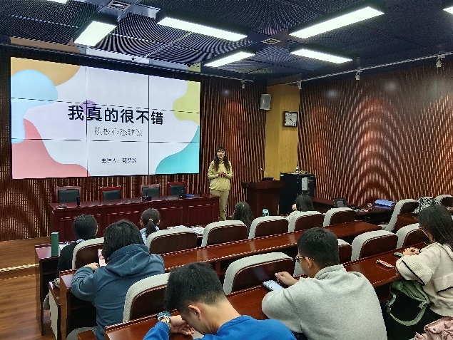 活动伊始,班梦姣以“幸福是一种什么感受”为问题引入,启迪同学们对幸福心理学的探讨,同学们认真思考、踊跃发言,班梦姣基于同学们的交流进行“我真的很不错”积极心态建设分享,围绕幸福心理学积极情绪、投入、人际关系、意义、成就等五个要素展开,同学们收获颇丰。