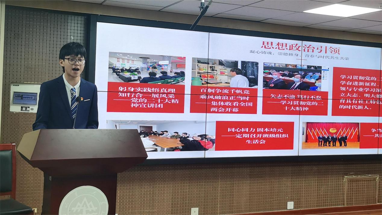 在答辩现场,27个班级的负责人按照抽签顺序依次进行班级答辩。首先,2020级毕业班的同学梳理了班集体三年来的成长轨迹与学习成果,向学弟学妹分享了班级组织建设经验,鼓励低年级班干部立足同学需求,以真诚付出提升服务效能,建设温馨班级共同体。随后2021、2022级员工骨干根据抽签顺序逐一展示了班级风采,各班立足专业特色,以班级结构建设、思想政治引领、五育兼修并举、成员成才赋能为线索,展现了求实创新的扎实学风和丰富多彩的班级成果。最后,2023级新生班委分享了班级成立以来的基本情况,并就班级建设目标提出了针对性的详细规划;他们表示未来将继续虚心向师长学习,在学科交融中博采众长,通过营造乐知乐学的团结氛围增强集体力量。答辩结束后,主持人吕奕涵做了简要总结,并鼓励各班在接下来的工作中不断探索创新班级管理建设方法,将班级打造成创优良学风、促全面发展的坚实阵地。