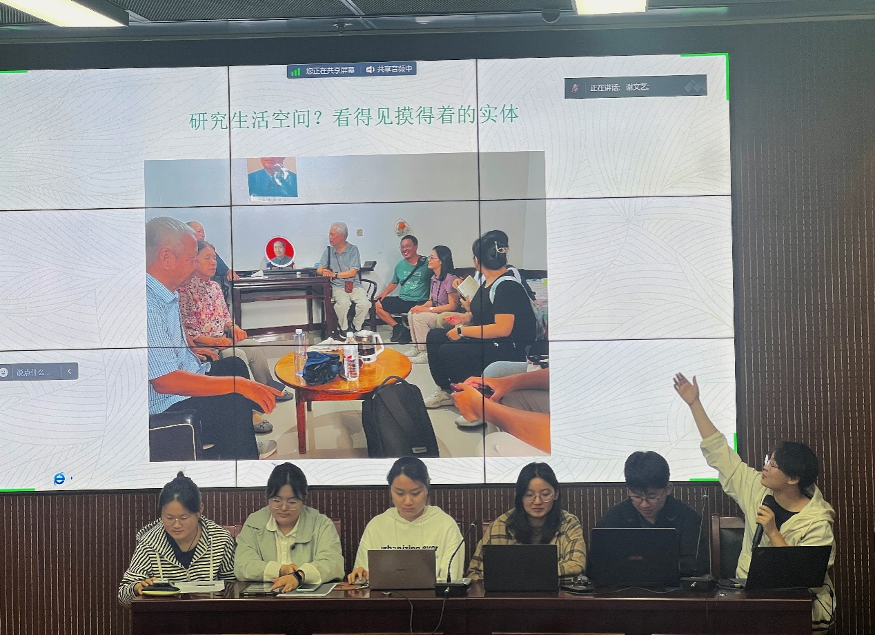 家庭结构和生活样式组由潘相宗和杨奕然两位同学组成。他们的报告从基本的家庭关系结构、人口迁移变化和村庄的社会福利及养老问题等维度展开。潘相宗详细讲述了这一部分的调查思路,展示了家庭成员变动、外界环境变动、家庭生活空间等问题,通过剖析这些问题并结合城市化的时代特点理解变化中的家庭关系。杨奕然关注社会保障和养老问题,如村集体福利情况、家庭养老方式等,将个案研究与广泛的社会背景联系起来,思考城市化进程下村庄养老的现状及家庭关系的变革。