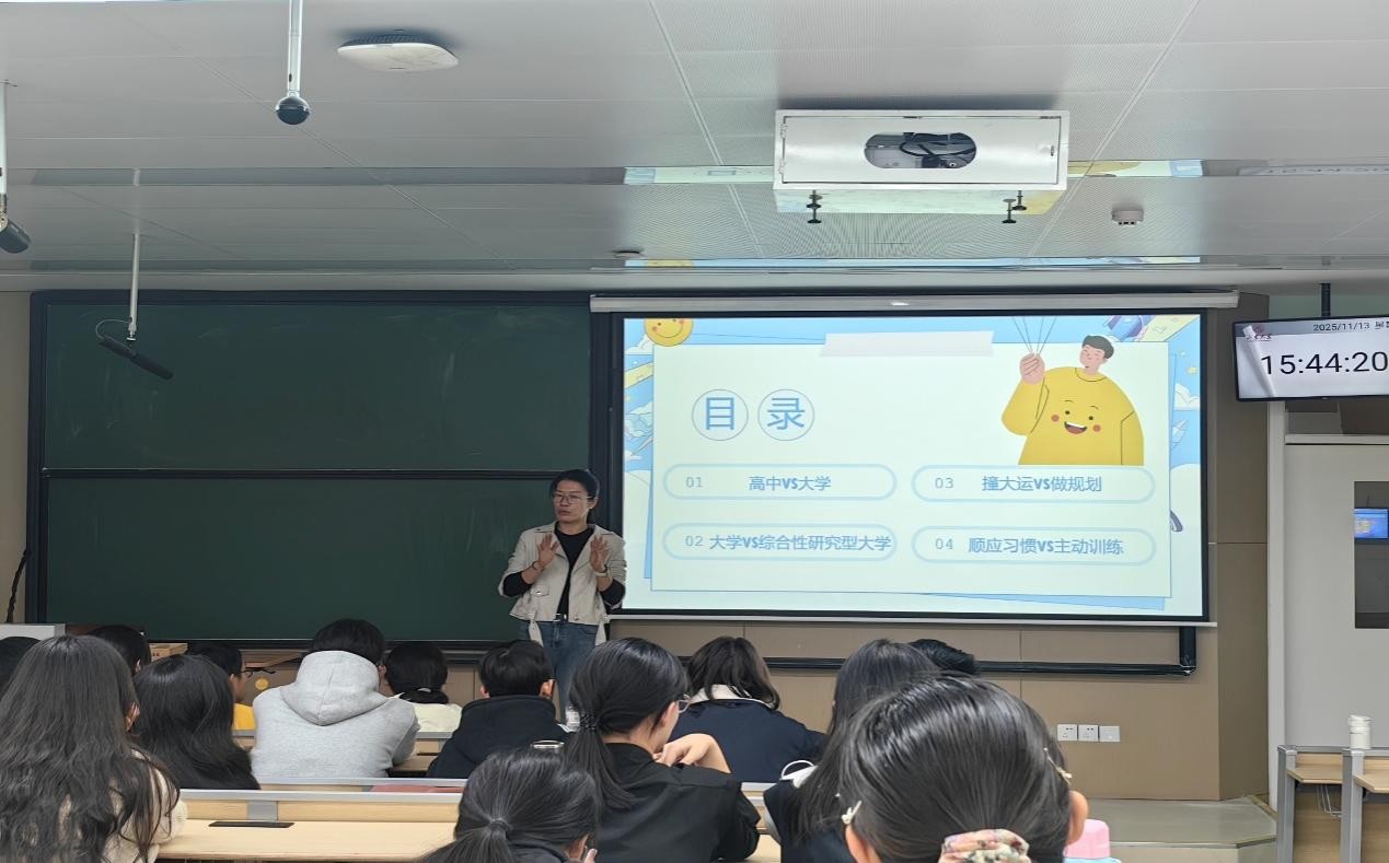 讲座伊始,翁祥栋以“高中VS大学”“撞大运VS做规划”等四组鲜明对比切入,结合老员工常见的心理适应困境,深入剖析环境转换与角色蜕变带来的双重挑战。她指出,高中阶段的“被安排式节奏”到大学“自主选择式旷野”的转变,不仅是学习模式的更迭,更易引发迷茫、焦虑等心理波动,而科学的生涯规划正是破解此类心理困境的关键抓手,“规划不是束缚,而是帮你在‘旷野’中锚定坐标,让成长有方向、心理有依托”。
