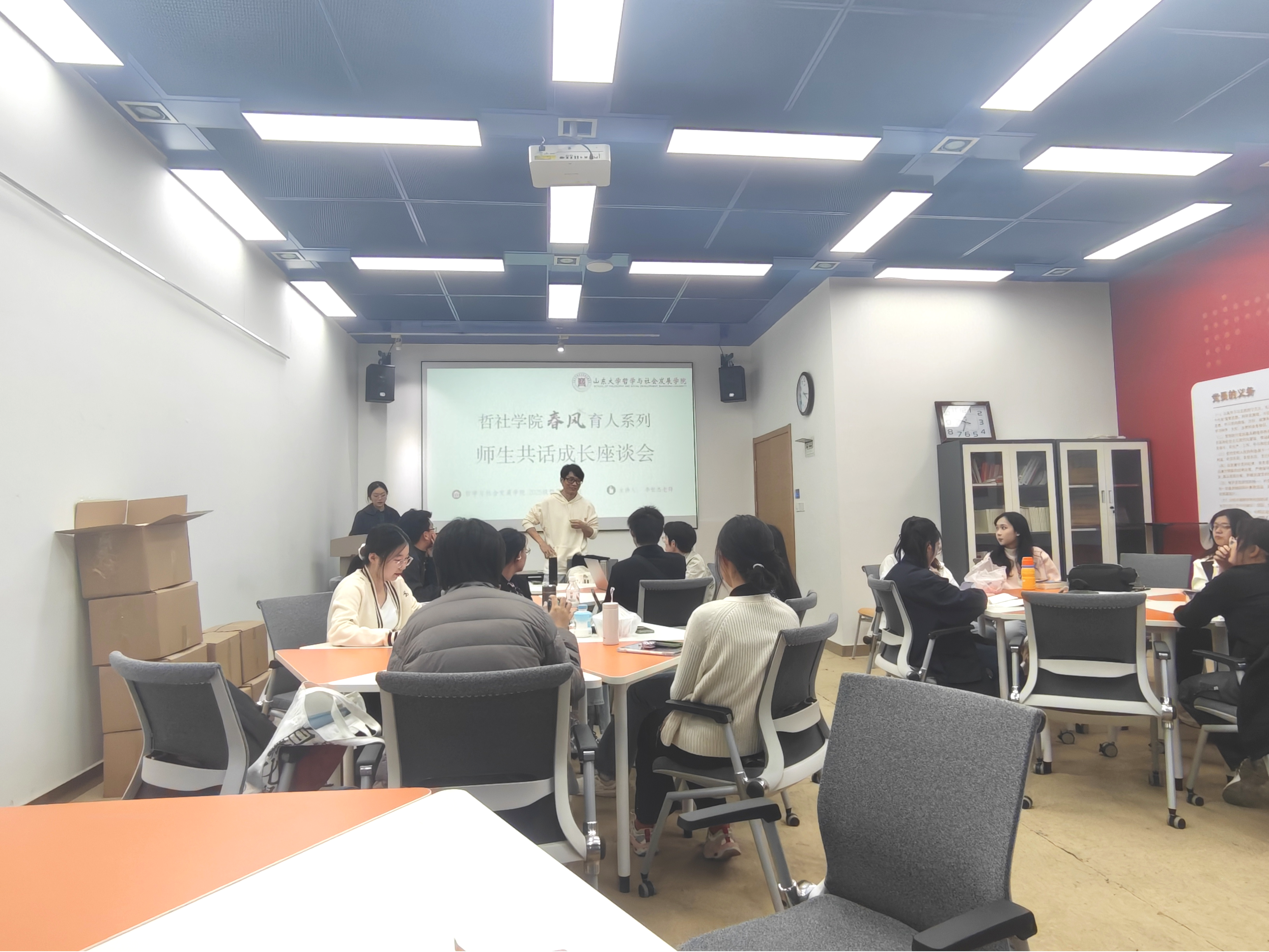 在互动环节,新生代表踊跃发言。梁迅旗分享了从初读哲学原著的困惑到通过读书会找到学习乐趣的心路历程;孟好介绍了平衡课业与课外活动的实践经验;黄潼夜则就如何选择未来哲学研究方向提出疑问。班主任李世杰逐一回应,指出哲学探索贵在广泛涉猎、厚积薄发,不必急于定位方向,关键在于保持好奇、持续积累、勇于尝试。他还就图书馆资源利用、选修课程选择及学业规划等提供了具体指导。