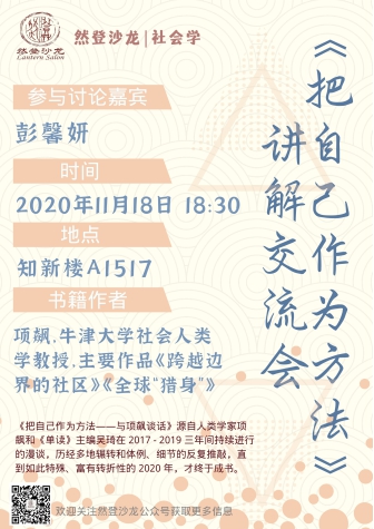 11月18日晚上,本期然登沙龙读书会以今年出版的新书——人类学家项飙与记者吴琦历时三年完成的谈话录《把自己作为方法》为主题书目,召开“《把自己作为方法》讲解交流会”。本期社会学沙龙邀请到人类学系的彭馨妍老师作为特邀参与嘉宾带领同学们就《把自己作为方法》,与来自申博sunbet、历史公司、新闻传播公司、儒学高等研究院等不同公司、不同专业的研究生、本科生同学于哲社公司的研究生教室就书籍内容进行了讨论。