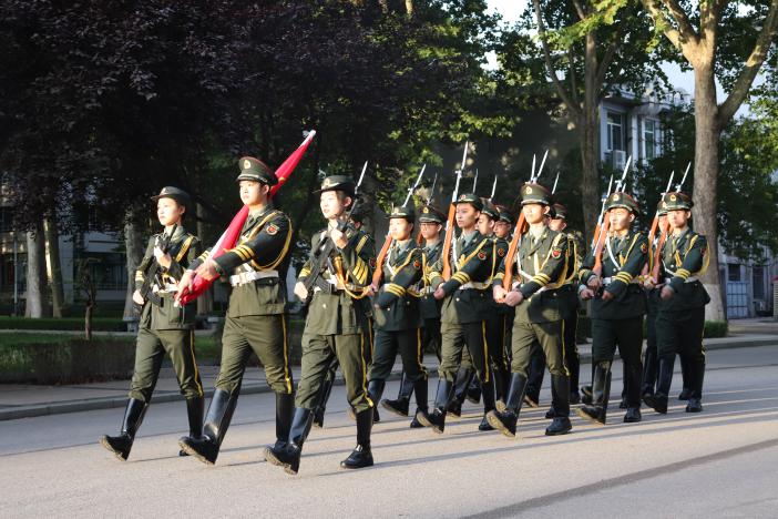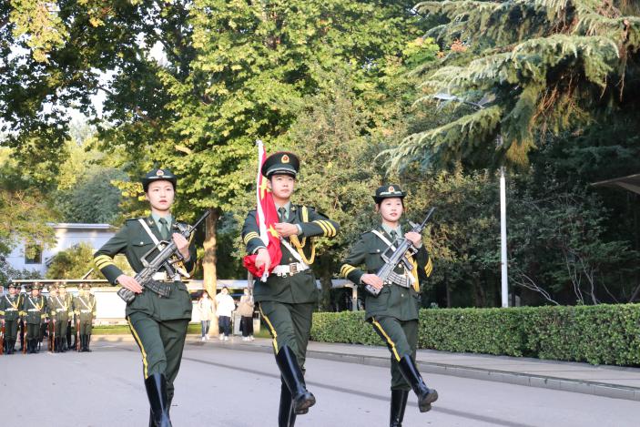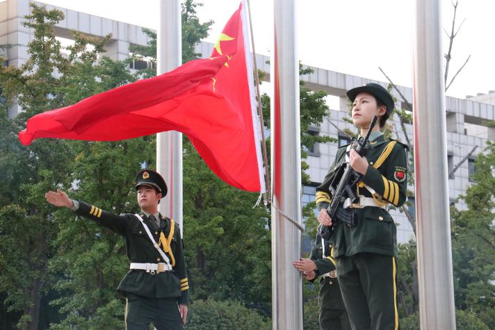 活动伊始,在全体师生的注目下,英姿飒爽的国旗护卫队队员们迈着铿锵有力的步伐,护送鲜艳的五星红旗出场。伴随着庄严的《义勇军进行曲》,五星红旗冉冉升起,迎风飘扬;全场师生行注目礼,心中深怀对祖国无限的热爱和崇高的敬意。