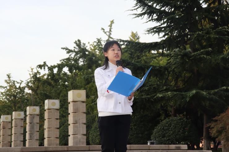 升旗礼毕,2020级新生张沁涵作为团员代表进行国旗下的演讲。基于对“中国梦”与“个人梦”作出的阐释,她呼吁作为新时代青年的我们继承“为中华之崛起而读书”的责任,秉承“有志者事竟成”的恒心,传承“立志宜思真品格”的方法,做到明志笃行、好学有为;要学习榜样先辈的坚守与奉献,从自身做起,珍惜韶华,脚踏实地;努力奋斗,砥砺前行;展现青春担当,托举中国梦想。这场饱含情感的演讲充分燃起了同学们的爱国之情与强国之志。同时她也提到,成长在这个机遇和挑战并存的时代,实现梦想的道路并不平坦。面对来势汹汹的新冠疫情,迫在眉睫的脱贫攻坚,我们只有与国家一体,以青年成才梦托举时代中国梦,才能共克时艰,圆梦中国。