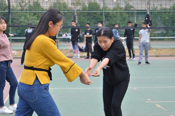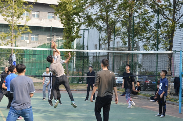 为熟悉规则,首先男女排队长及队员带领新生进行垫球、传球等基本动作的学习。随后迎新赛正式开始。比赛共分为两轮。第一轮分三组同时进行,男生一组,女生两组。各队均由新老生混合组成。虽然只是友谊赛,但参与人员都全身心投入,比赛场面十分激烈。男生组在稍有寒意的秋风中发球、起跳、拦网,再加上大力扣球,展现了男生的意气风发。女生组也不甘示弱,一个个英姿飒爽,动作也丝毫不含糊。第一轮结束后,参赛人员重新分组。稍事休息之后,男女各一组开始了新一轮的比拼,继续在排球场上挥洒汗水。在一番激烈角逐之后,迎新赛在10点30分结束。