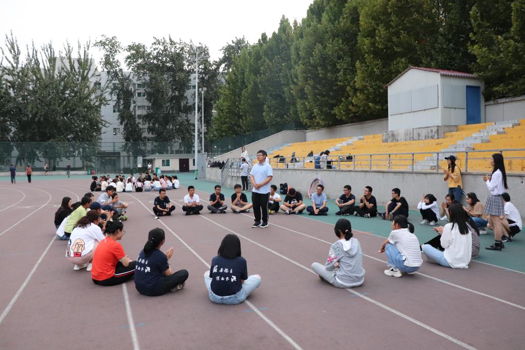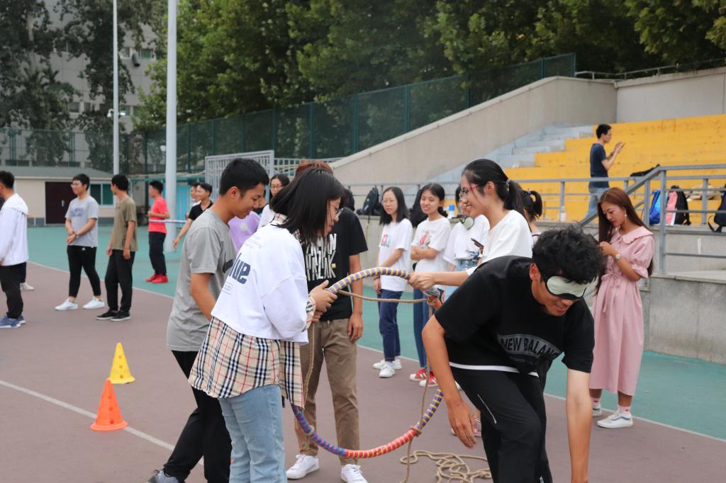 田径场上的活动由哲社公司院员工会组织展开,新生们按班级分成三个小组,每个小组由一名院员工会干事带领参与游戏。首先干事们组织各个小组围成一个圆圈在音乐的指引下集体跳兔子舞。在刚开始跳时,同学们出现了踢到其他同学的情况,这种情况在同学们善意的谅解和欢乐的笑声中逐渐减少,慢慢的大家都跟上了音乐的旋律并熟悉了舞蹈的动作,有节奏地跳完了兔子舞。接着进行的是蒙眼游戏,游戏采取两两合作形式,由一个同学引导另一个被蒙住眼的同学慢慢穿过呼啦圈,再引导他越过呼啦圈旁的绳子。蒙眼游戏不仅加强了同学们的团队协作精神,提高合作能力,还促进了同学之间的友谊。最后同学们还做了击鼓传花、千千结等一系列的小游戏,一些小组还自发地玩起了同学们当场想到的小游戏,活动场面十分热闹,同学们充满了激情与活力。一个小时过后,本次新生素拓活动在欢乐与笑声中圆满结束了。