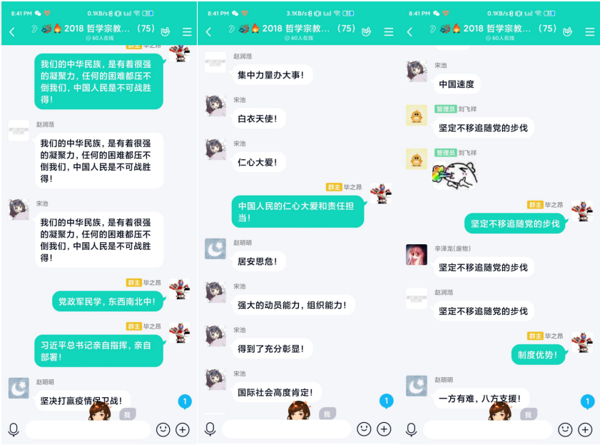 2018级哲学班的同学们:所有的同学都坚信,在以习近平同志为核心的党中央的正确领导下,打赢这场疫情防控的人民战争,打赢全球防疫总体战,国家保卫战,疫情阻击战。作为当代青年老员工的我们,正是勇于担当责任,承担使命的时候,在党的带领下,我们必将迎来美好的春天,必将迎来富强民主文明和谐的强国梦复兴梦!