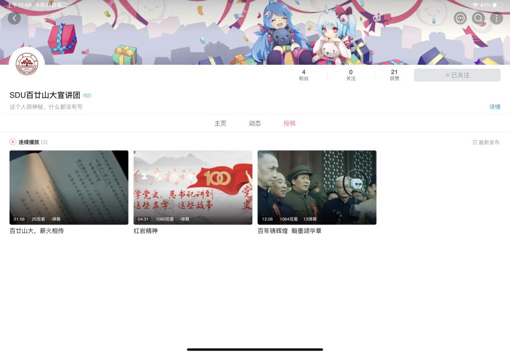 8月28日至8月30日,宣讲团在哔哩哔哩网站上注册了名为“SDU百廿山大宣讲团”的用户账号,并陆续发布了三个党史校史宣传视频。视频“百年铸辉煌,翰墨颂华章”由团队成员刘佳林制作,讲述了从1840年起中国的历史变革和党与新中国共同成长的历程。视频“红岩精神”由团队成员石亦初制作,具体阐释了“红岩精神”的时代内涵。视频“百廿山大,薪火相传”由团队成员刘程昊制作,展示了百廿山大的历史底蕴和精神传承。