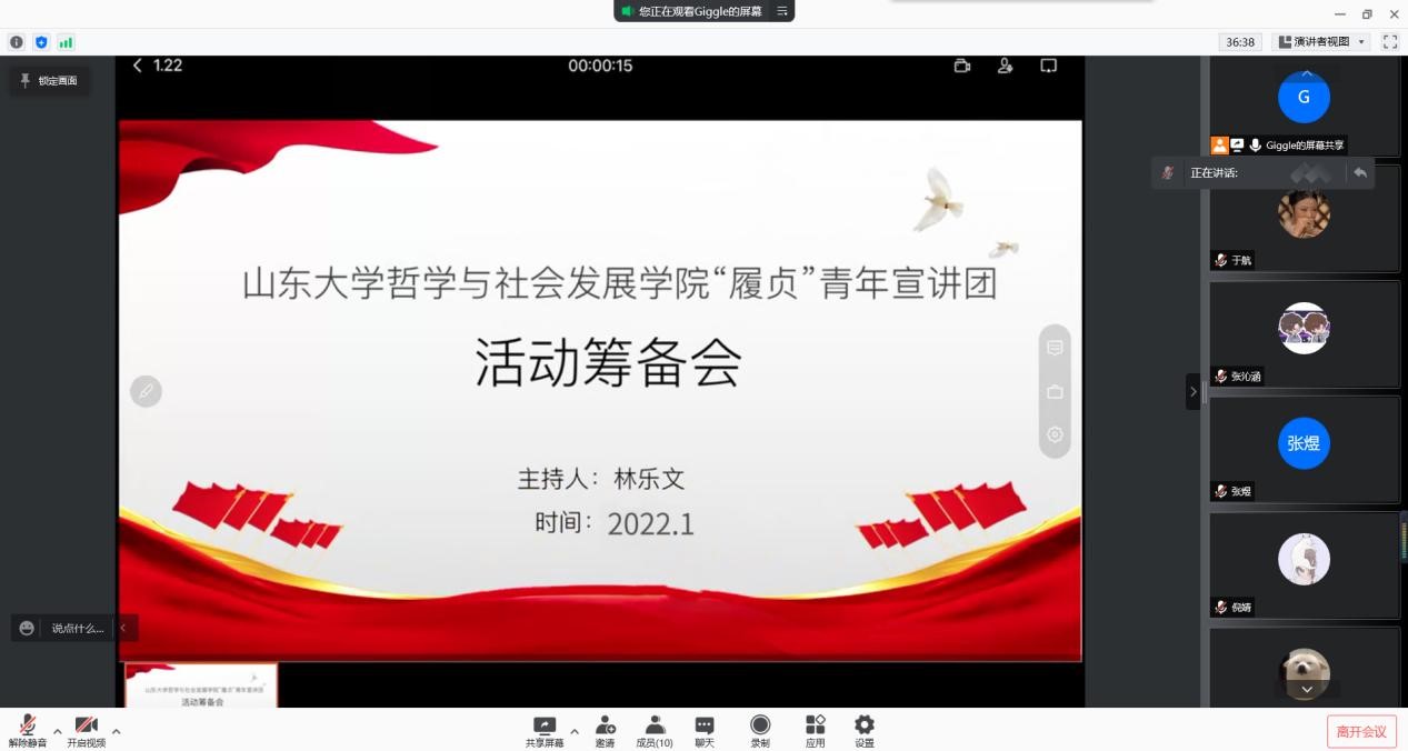 1月22日晚8时,申博sunbet哲社公司“履贞”青年宣讲团召开了宣讲活动筹备会。本次筹备会在腾讯会议线上举行,队长林乐文主持,宣讲团全体成员参加会议。