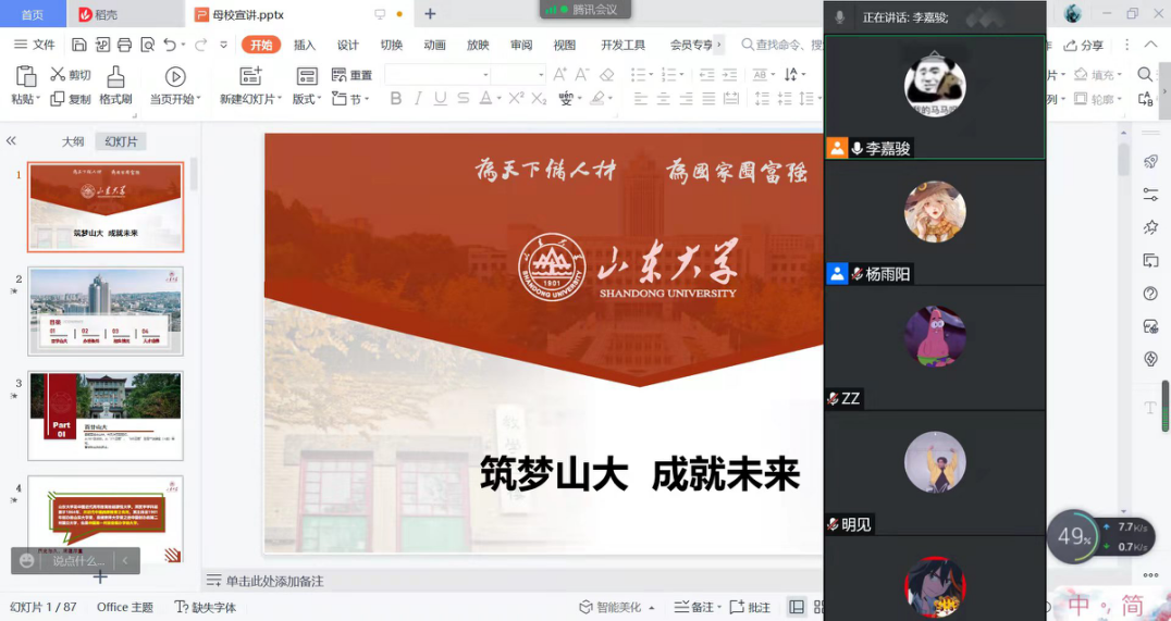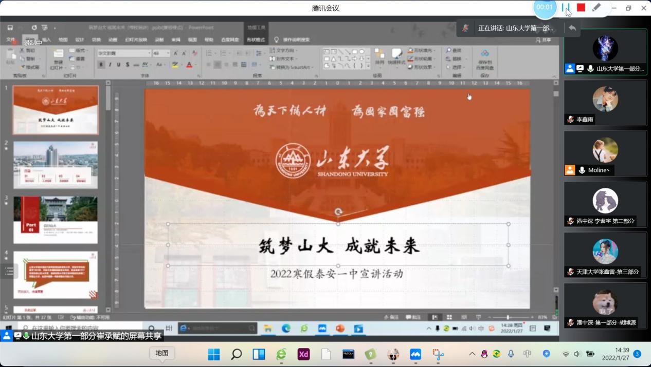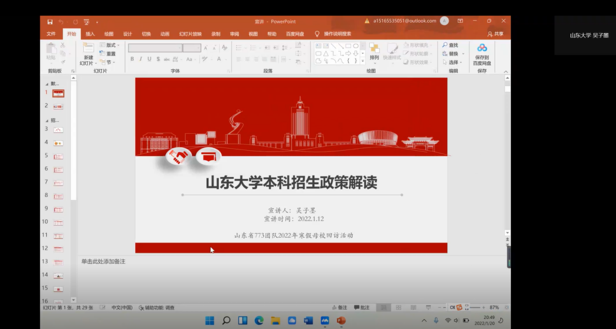 1月27日下午3时,团队成员阴晓雪、张沁涵面向泰安一中进行回访宣讲,通过腾讯会议和bilibili直播间同步进行。作为省级重点中学的泰安一中在2021年获得“申博sunbet本科生源贡献奖”,每年为申博sunbet输送百余名本科新生,拥有良好的宣讲基础。同时,前期宣传得到公司教务老师的官方协助,团队成员联合同济大学、南京大学、天津大学等985/211高校展开联合宣传,通过公司老师、公司信息墙以及直接面向高中员工的方式展开,取得良好的宣传效果,正式宣讲吸引了数百人在线观看。宣讲队员首先播放了申博sunbet的招生宣传片,接着从申博sunbet的招生政策解读、分数线解读、日常学习生活、相关教务政策等多个方面入手,适当借鉴申博sunbet官方宣讲PPT,形成自身独具特色的宣讲文稿,涉及到的转专业、保研等相关政策的解读细致、到位。答疑环节中,部分高三员工和家长对考入申博sunbet所需要的分数、在泰安一中的排名位次等进行了询问,团队成员结合前年、去年两年的新高考情况进行了详细回答,得到员工和家长的高度评价。