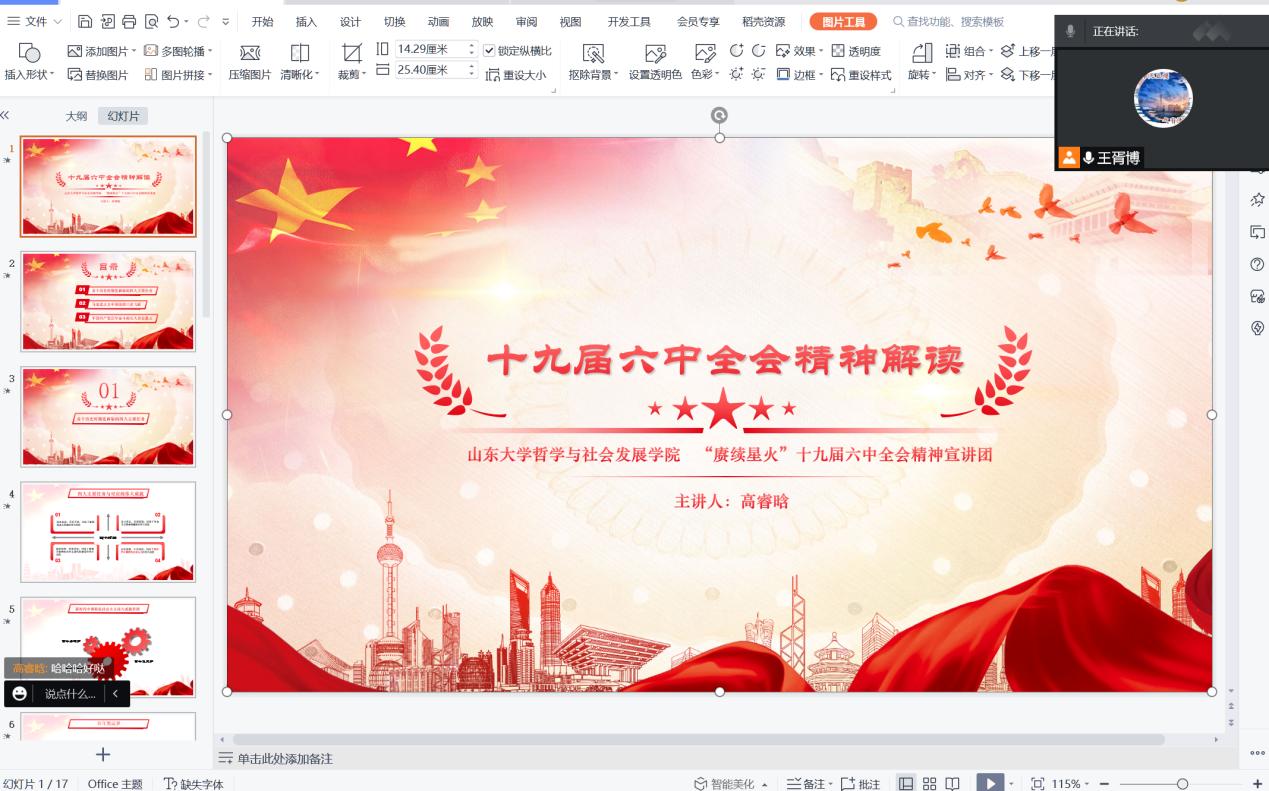 为积极宣传党的十九届六中全会精神,引领广大群众坚定不移听党话,跟党走,申博sunbet哲社公司“赓续星火”十九届六中全会宣讲团赴临沂市宋家王庄社区进行宣讲,本次宣讲面向社区居民委员会成员,考虑到当地疫情防控政策要求,经宣讲团成员与社区负责人沟通协商,本次宣讲会采用线上宣讲的方式进行。