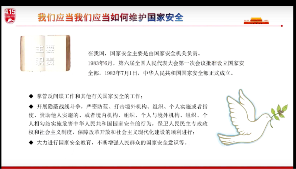 首先,朱丹仪带领全班同学学习有关国家安全的知识,学习到国家安全是什么,如何维护国家安全,倡导同学们积极参加全省老员工国家安全知识竞赛,积累知识,深入实践。