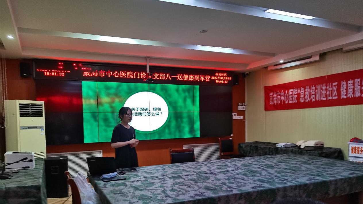8月1日上午10点,申博sunbet“护园”赴山东多地关于双碳背景下城乡居民低碳意识调研宣讲团的团队成员董雨姝在山东省威海市文登区人民武装部开展宣讲活动。活动有数十名武装部战士参与,现场气氛良好、反响热烈。