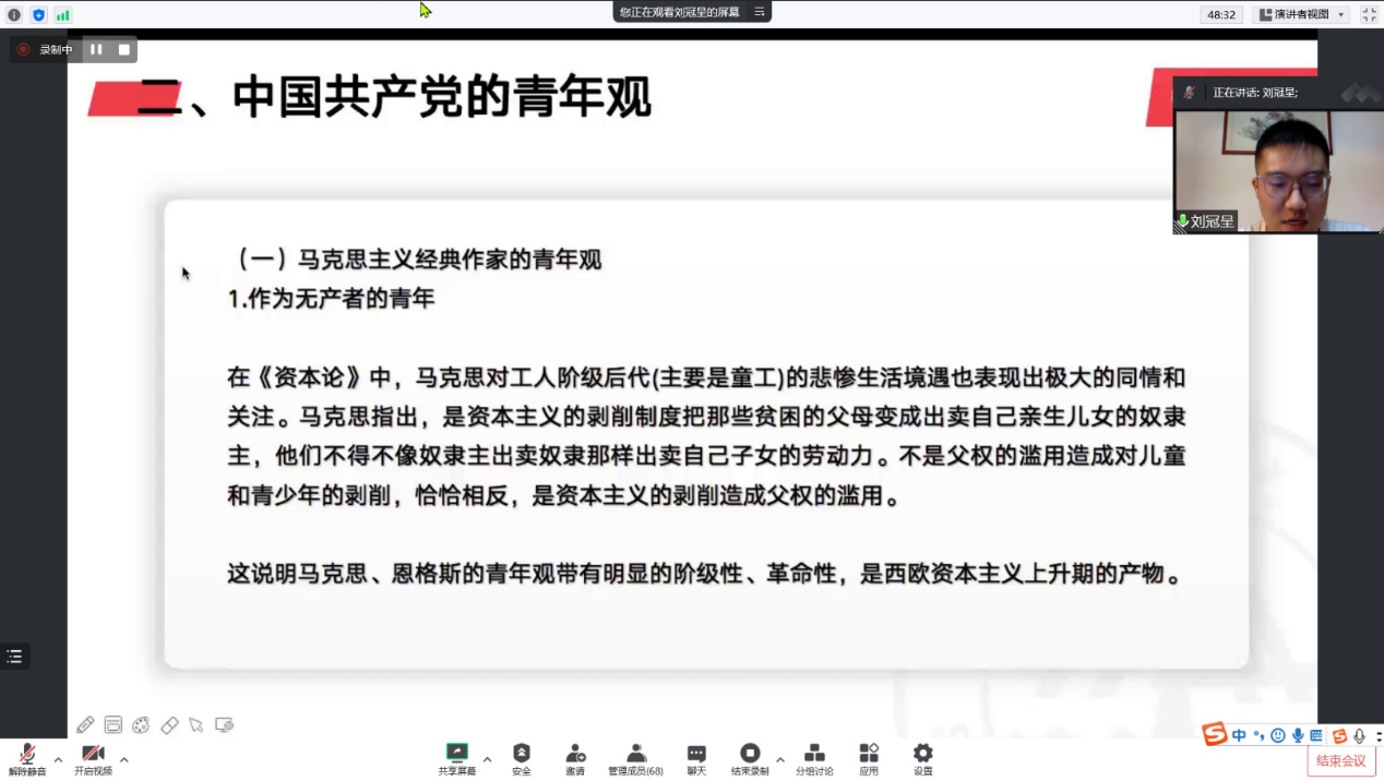 刘冠呈在宣讲中带领大家回顾了中国共青团的光辉历程,系统地梳理了中国共产党的青年观,最终号召大家做“自主的而非奴隶的,进步的而非保守的,进取的而非隐退的,世界的而非锁国的,实利的而非虚文的,科学的而非想象的”时代青年。