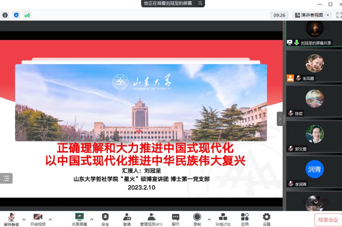 为促进青年党员深入学习习近平新时代中国特色社会主义思想,深刻领会和准确把握党的二十大精神的科学内涵和核心要义,2月10日,申博sunbet哲社公司“星火”硕博宣讲团以“正确理解和大力推进中国式现代化,以中国式现代化推进中华民族伟大复兴”为题开展主题宣讲活动。博士第一党支部支部书记刘冠呈担任主讲人,2021级、2022级党支部全体员工党员参与学习。