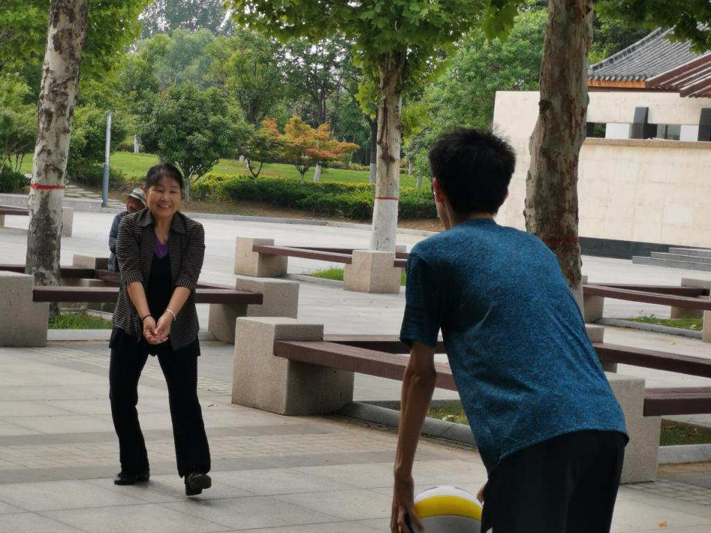 队员滕文博在与乘凉的老人们交谈中发现,老人们对气排球运动并不了解,甚至完全不知道气排球是什么。成员们同老人们介绍了项目的历史与竞赛规则,并向老人们展示了气排球。老人们被球体轻盈、柔软、比赛中不需要肢体对抗的特点吸引,并展现了浓厚的兴趣,纷纷表示愿意尝试新项目。于是,队员们现场向老人们展开了气排球教学。队员们教得认真,老人们学得也十分努力。简单又不失细致的教学过后,队员们组织老人们展开了气排球比赛。全新的气排球项目给老人们带来了极大的乐趣,队员与老人们愉快的谈笑声为清晨的龙潭公园注入了新鲜的活力。
