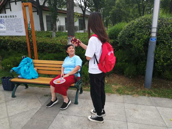 队员们来到龙潭公园后,发现公园里有许多老人正在开展休闲娱乐活动。他们有的在跳广场舞,有的在打太极拳,有的在练习柔力球,还有的结伴在树荫下乘凉聊天。队员们发现,枣庄市老年人群体的休闲活动较为丰富多样。据前一天的调查,团队得知,除广场舞外,柔力球也是极受当地老年人欢迎的项目。队员夏梦瑜在打柔力球的老人们休息时与她们进行了交谈,得知她们有非常规律的训练时间与系统的训练方法,而且柔力球群体规模较大。领队老人表示,柔力球相对于广场舞而言更具有技巧,对柔韧性要求更高,能够全方位锻炼身体与大脑,具有趣味性。