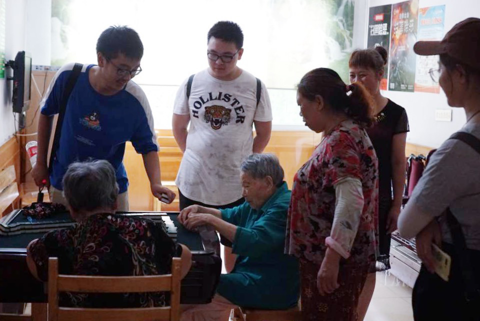 随后,在负责人以及其他工作人员的帮助下,团队成员与不少老人打招呼、聊天;其中4名成员与一位沟通无障碍的张婆婆进行交流,了解到她是贵州人,退休之前一直在重庆工作,但是由于儿女居住的有点远,照顾不周,就选择了这个虽然位置有点偏但离家近的养老场所。