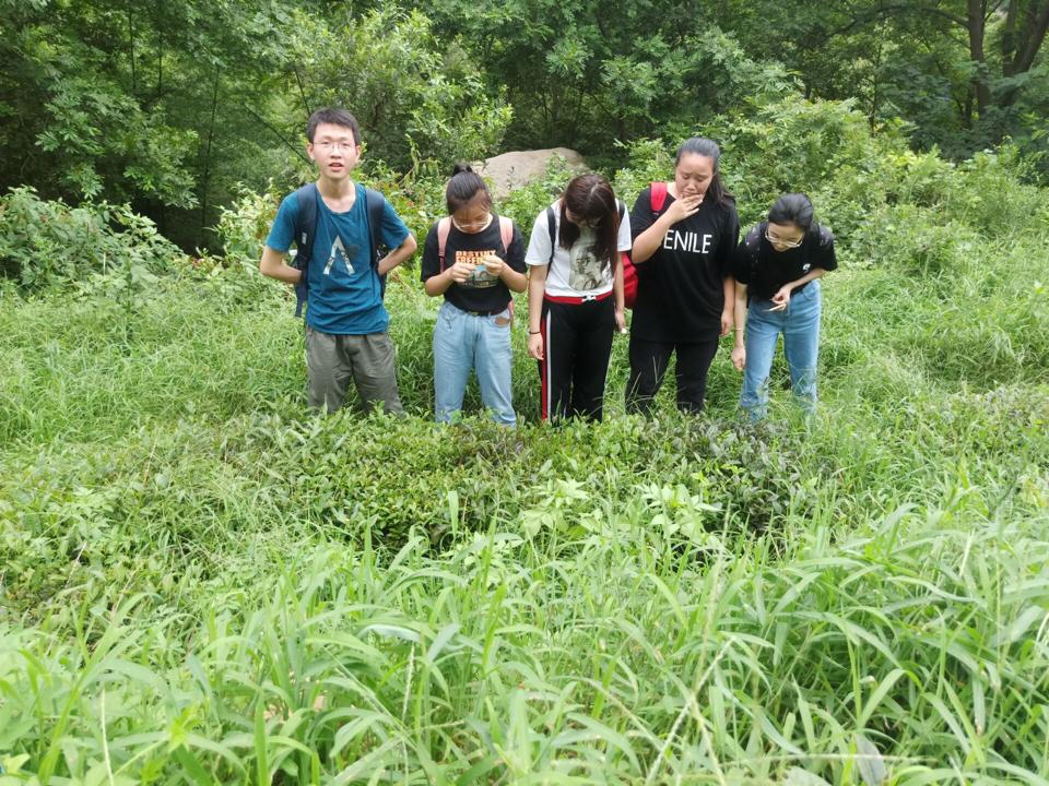(调研团徒步登山到达茶园)