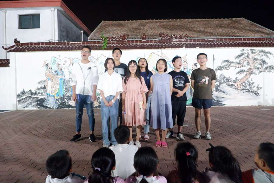 晚上,团队成员与葵堌堆村村民齐聚会盟广场,举办了一场精彩的文艺汇演。在两位队员的主持下,进行了广场舞《卡路里》、合唱歌曲、街舞等节目的表演。其中,广场舞《卡路里》为几天前团队成员向村民教授,在本次文艺汇演中,村民们再度表演这支舞蹈,展现自己的学习成果和对于舞蹈的喜爱;唱跳歌曲节目受到了村民们的热烈掌声,可见大家对于表演的肯定;在汇演尾声时,团队成员齐唱校歌《我的山大我的家》,展现本校员工的爱校之情和精神风貌。