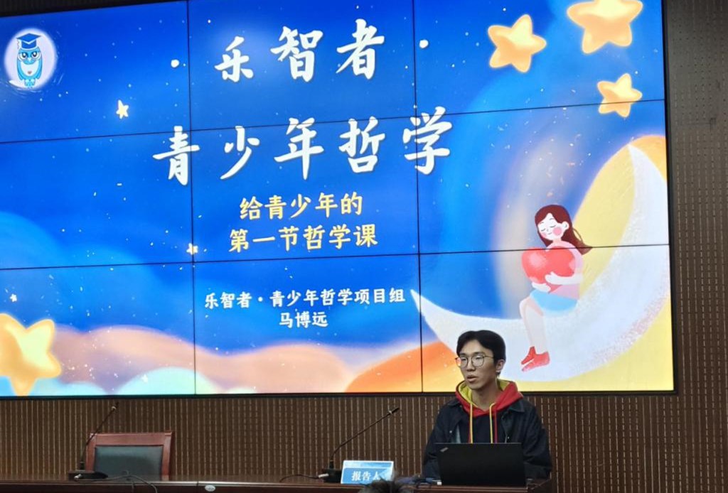 活动伊始,哲社公司乐智者·青少年哲学项目组负责人马博远从“项目背景”、“项目设计”和“项目成果”等多个角度论证“乐智者”青少年哲学课项目的创新性、可行性及推广价值。在思辨的项目论证里,同学们逐渐认识到如何确立和完善一个项目,例如,如何从专业出发找寻问题与需求、拥有项目雏形后如何进行项目设计、具备项目规划后如何落地实践与成果产出。