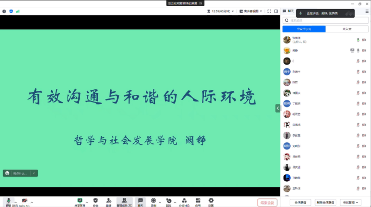 为帮助22级研究生增强与老师、同学的交流与联系,提升人际沟通能力,形成利于学术发展与健康生活的人际环境,6月11日晚,哲社公司在线上举办“走进心灵”有效沟通讲座,公司党委副书记、研究生辅导员阚铮担任主讲,2022级部分研究生参加。