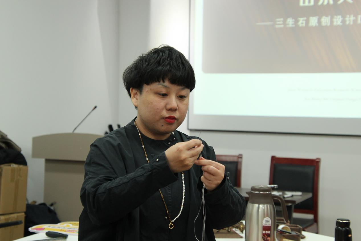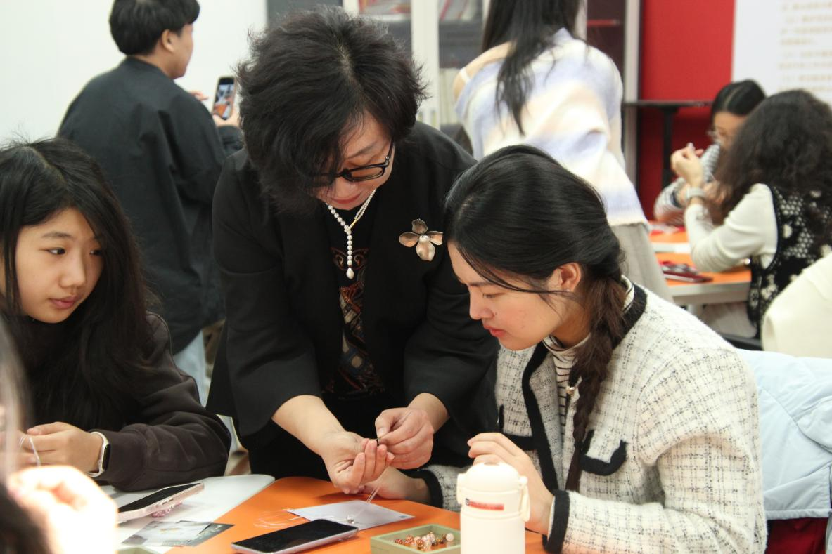 活动伊始,公司党委副书记杨晓玲致辞,向大家介绍了参与此次活动的专家老师,邀请在场师生全身心投入此次手作活动,享受心灵疗愈的过程,感受指尖艺术的独特魅力。随后,来自山东三生石文化传媒有限公司的珠宝专家杨阳与李艳艳两位老师,围绕原创新国风珠宝的设计理念、晶石特性、佩戴搭配技巧等展开了讲解,结合手工制作基础技法进行演示,激发了大家的浓厚兴趣。
