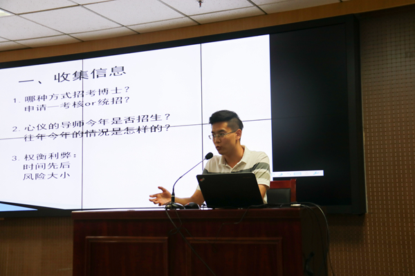 刘蕴霆和惠贤哲分享了考博的经验。刘蕴霆学长介绍,考博时收集信息非常重要,我们要了解目标院校招收博士的方式,是申请-考核制还是统招,还要了解目标导师的今年是否收员工。准备材料是考博的另一重要内容,包括个人陈述、科研论文、外语成绩、获奖证书等;其中论文要能反映自己的学术水平,可以是发表的也可是未发表的。惠贤哲学姐介绍了自己考博的时间线索和备考经验。进入研二下学期,在三四月份开始浏览各个大学的研究生招生信息网,搜集报考信息,五六月份开始准备材料和英语成绩,暑假开始到年进行报名,到此年的一到五月参加笔试和面试。她还提到了考博期间可能会遇到的心理压力与抉择困境,对于前者,她建议同学们在考博期间多与家人朋友沟通,及时排解;在选择录取公司时也会面临抉择,常常拿不定主意,此时应该向导师寻求帮助和建议。