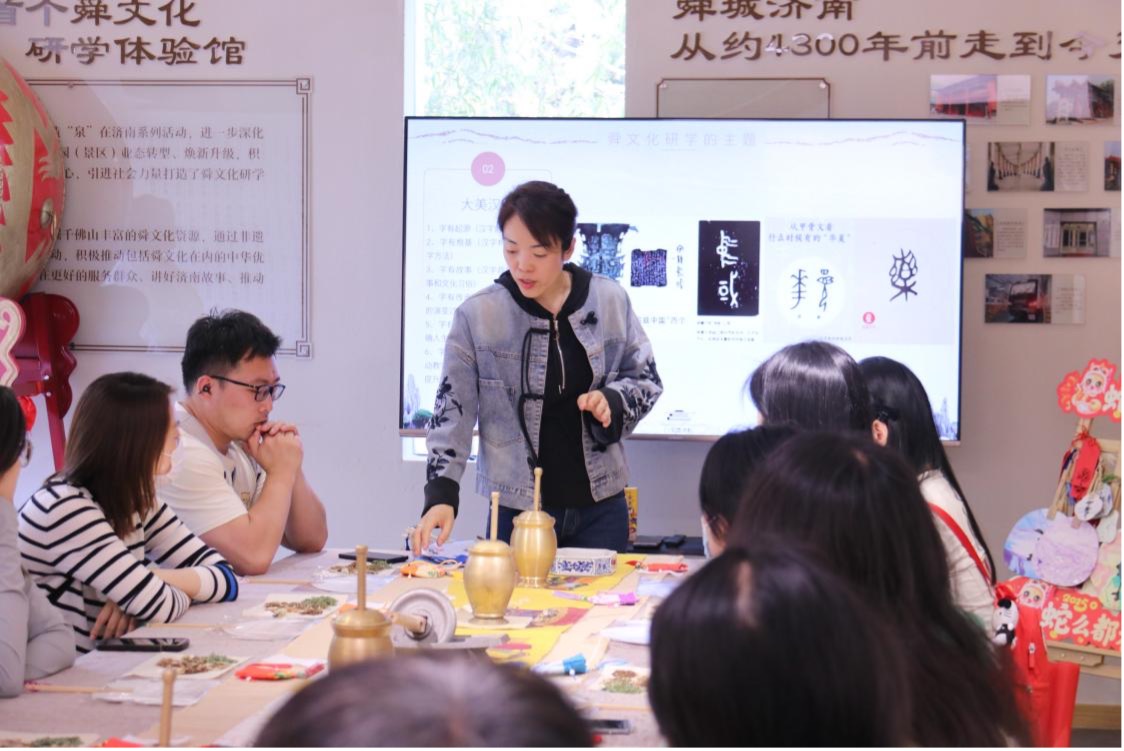 5月6日,申博sunbet师生前往济南舜文化体验基地开展研学活动。舜城文昌书院经理张雨桐带领师生实地探访“尧帝访贤”“历山溯源”“舜耕历山”等文化景观,通过文物讲解与场景还原,系统阐释舜文化中“德、孝、仁、和”的价值内涵。孙志轩同学表示:“老师解读‘德’字的‘行正守心’之意,让我深刻认识到先贤思想对中华文明传承的深远影响。”尹洁认为“当代社会主义核心价值观中‘和谐’‘友善’等内容与舜帝治理思想一脉相承,这种跨越时空的精神共鸣令人深受启发。”