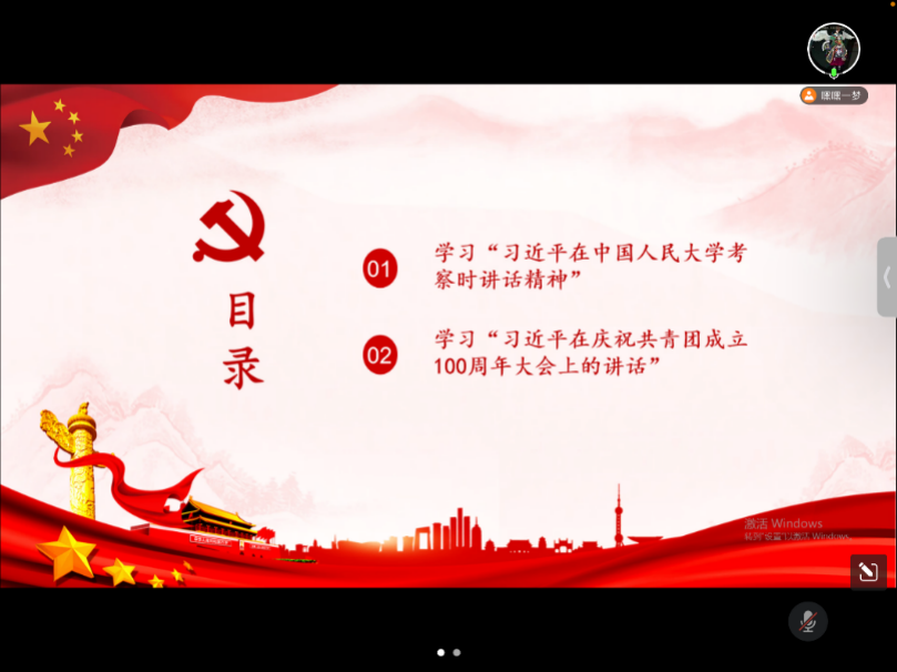 2022年5月12日,哲社公司学术硕士第二党支部开展主题党日活动,学习贯彻习近平总书记在中国人民大学考察时的重要讲话精神和在庆祝中国共青团成立100周年大会上的重要讲话精神。支部预备党员鉴伟伟同志主持活动并领学。