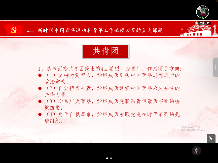 随后,鉴伟伟同志带领支部成员共同学习习近平总书记在庆祝中国共青团成立100周年大会上的讲话,着重学习“在新的征程上,如何更好把青年团结起来、组织起来、动员起来,为实现第二个百年奋斗目标、实现中华民族伟大复兴的中国梦而奋斗”这一重大课题。习近平总书记指出,新时代的中国青年,更加自信自强、富于思辨精神,同时也面临各种社会思潮的现实影响,难免会在理想和现实、主义和问题、利己和利他、小我和大我、民族和世界等方面遇到思想困惑。在这样的背景下,习近平总书记给共青团提出的四点希望,为青年工作指明了方向:第一,坚持为党育人,始终成为引领中国青年思想进步的政治公司;第二,自觉担当尽责,始终成为组织中国青年永久奋斗的先锋力量;第三,心系广大青年,始终成为党联系青年最为牢固的桥梁纽带;第四,勇于自我革命,始终成为紧跟党走在时代前列的先进组织。