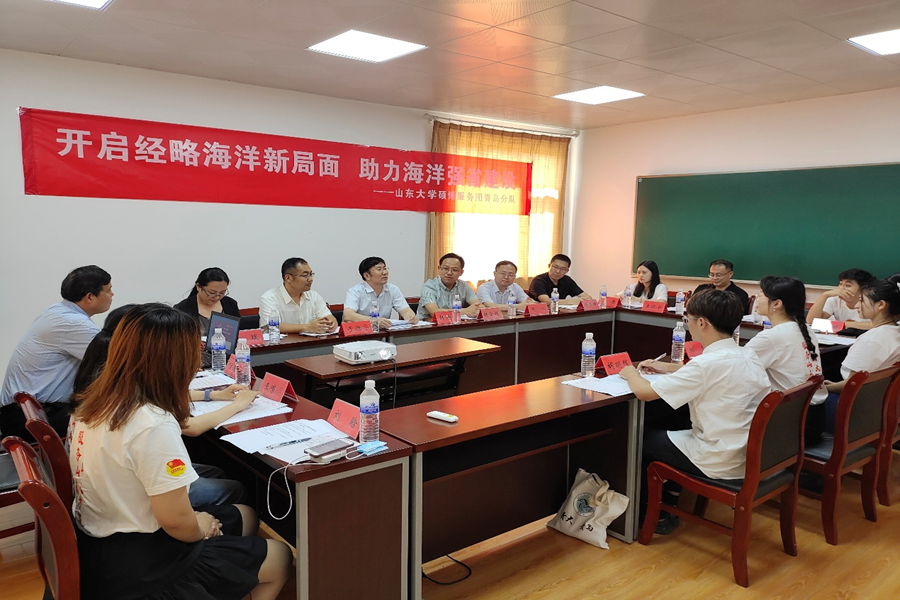 座谈会上,赵全超书记介绍了团市委与各驻青高校的关系和工作开展情况,胡明辉主席和滕乐峰处长分别就青岛市三下乡社会实践开展情况、青岛市海洋产业集聚区建设情况进行了介绍。公司辅导员封莹老师就我们团队的基本情况、调研目的、调研计划、公司社会实践工作开展情况等进行了汇报,队员郝杰作了表态发言。在听取师生们的汇报后,韩圣浩董事长带领大家回顾了青岛和山大携手走过的光辉岁月,肯定了团队成员付出的努力,并对服务团如何开展好社会实践提出了具体要求。我们深受启发,并且信心大增。